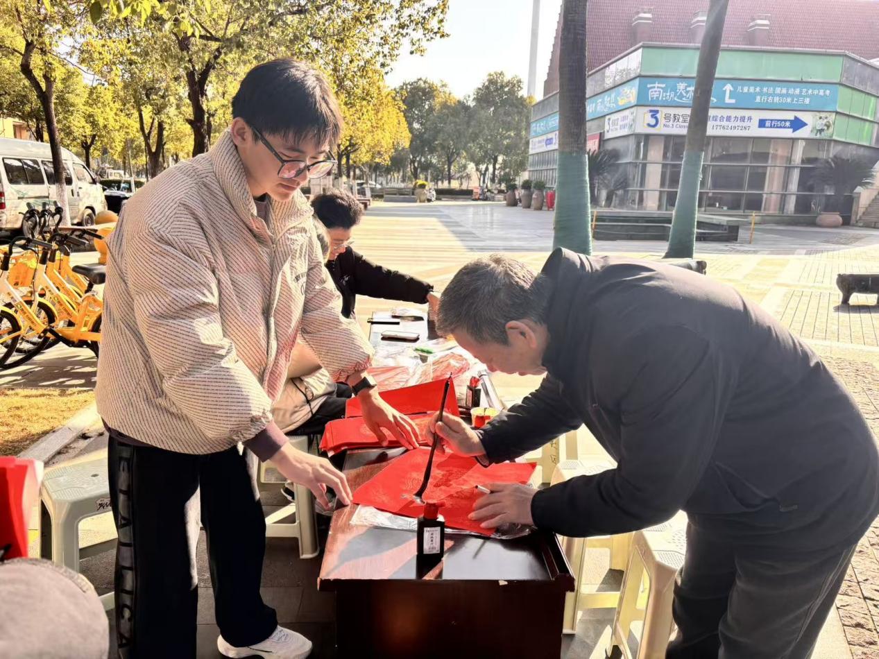 今日,系列活动走进金地格林社区,开展传统文化公益宣传活动。活动现场,学子们通过赠送春联、福字等方式,为社区居民送上新春的祝福与问候。同时,学子们创新融合中西文化,展示了将西方拼豆工艺与中国传统文化元素相结合的特色手工作品,巧妙呈现了传统与现代、东方与西方的文化碰撞。此外,学子们还向社区居民积极宣传了资环学院的话剧作品,邀请居民走进校园感受话剧文化的魅力,进一步扩大了学院文化活动的影响力。